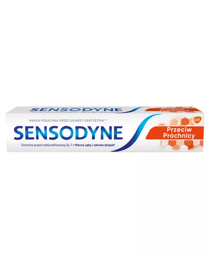 Pasta do wrażliwych zębów Sensodyne Przeciw Próchnicy z fluorem, została stworzona, by łagodzić skutki nadwrażliwości zębów i w ten sposób chronić je przed rozwojem próchnicy. Pasta działa wewnątrz zębów, łagodząco na zakończenia nerwowe zębów. Jej specjalna formuła zawiera łagodzący nadwrażliwość zębów azotan potasu oraz fluorek, który wzmacnia szkliwo, sprzyjając jego remineralizacji. Dzięki temu pasta nie dopuszcza do rozwoju bakterii tworzących płytkę nazębną i produkujących kwasy osłabiające szkliwo, co może dalej prowadzić do rozwoju próchnicy. Aktywnie wzmacnia zęby, a także usuwa kamień nazębny, dbając o zdrowie dziąseł. Przy regularnym szczotkowaniu dwa razy dziennie Sensodyne Przeciw Próchnicy zapewnia całodobową ochronę przed nadwrażliwością.