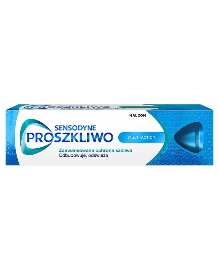 Sensodyne ProSzkliwo Multi Action to wielozadaniowa pasta z fluorem do zębów, która pomaga dbać o odpowiednią higienę jamy ustnej o zdrowsze i mocniejsze zęby. Unikalna formuła pasty zawiera kompozycję starannie dobranych minerałów, które wnikają głęboko w powierzchnię szkliwa, aby skutecznie je wzmacniać i utwardzać. Dzięki temu zęby są lepiej chronione przed niszczącym działaniem kwasów pochodzących ze składników codziennej diety, które mogą być przyczyną powstawania próchnicy. Aby zapewnić jeszcze lepszą ochronę przed jej wystąpieniem, skład pasty Sensodyne ProSzkliwo Multi Action wzbogacono również fluorkiem, jednocześnie pasta oferuje także wszystko to, czego oczekujesz od tradycyjnej pasty do zębów. Podczas szczotkowania dwa razy dziennie skutecznie oczyszcza i usuwa płytkę bakteryjną, pomaga zachować zdrowe zęby i dziąsła, a jej wybielające właściwości rozjaśniają zęby i przywracają im naturalną biel. Orzeźwiający, miętowy smak pozwala dłużej cieszyć się uczuciem świeżości i czystości, dzięki czemu Sensodyne ProSzkliwo Multi Action to doskonały wybór, który zapewnia kompleksową pielęgnację na co dzień!