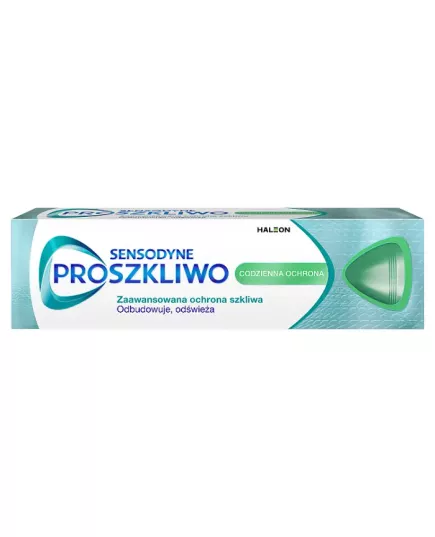 Pasta do zębów z fluorem Sensodyne ProSzkliwo Codzienna Ochrona z fluorem, to Twoje profesjonalne wsparcie w zapobieganiu próchnicy. Unikalna formuła pasty zawiera fluorek oraz starannie opracowaną kompozycję minerałów, które wnikają głęboko w powierzchnię szkliwa, aby skutecznie je wzmacniać i utwardzać. Dzięki regularnemu stosowaniu Sensodyne ProSzkliwo Codzienna Ochrona, szkliwo staje się mocniejsze, zdrowsze i lepiej chronione przed szkodliwym działaniem kwasów cukrowych z codziennej diety, które są jedną z najczęstszych przyczyn próchnicy. Skład pasty Sensodyne ProSzkliwo Codzienna Ochrona pomaga również utrzymać zęby i dziąsła w odpowiedniej czystości i może być stosowana także przez osoby, które cierpią z powodu nadwrażliwości zębów. Miętowy smak pozwala cieszyć się świeżym oddechem, dzięki czemu Sensodyne ProSzkliwo Codzienna Ochrona gwarantuje to, co tradycyjna pasta i dodatkowo chroni Twoje szkliwo przed zniszczeniem.