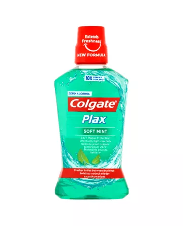 Świeżość która trwa! Odkryj nową odsłonę płynu do płykania jamy ustnej Colgate Plax Soft Mint o delikatnym, miętowym smaku! Colgate Plax Soft Mint zapewnia długotrwałą świeżość i piękny uśmiech. Zapewnia 24/7* ochronę przed płytką nazębną, więc masz pewność, że dbasz o zęby za każdym razem, gdy go użyjesz. Testowany klinicznie przez dentystów wspiera wybielanie, nie powoduje pieczenia, nie zawiera alkoholu etylowego. *Bakterie płytki nazębnej przy stosowaniu dwa razy dziennie."
