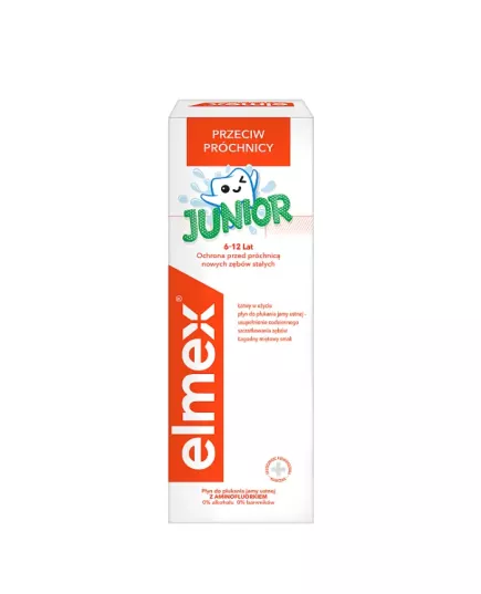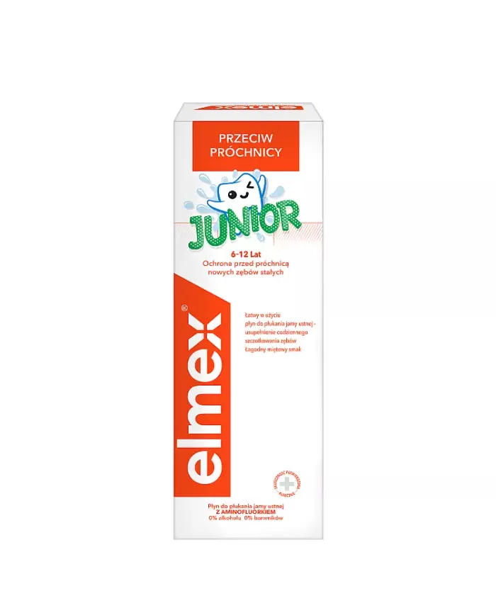 Płyn do płukania jamy ustnej elmex® Junior polecany dla dzieci w wieku od 6 do 12 lat zapewnia dodatkową ochronę nowych zębów stałych. Wysoce skuteczna formułą z aminofluorkiem tworzy wokół zębów ochronną warstwę wapniowo-fluorową, która remineralizuje i chroni przed próchnicą. Dociera także do miejsc trudno dostępnych dla szczoteczki do zębów, które są bardziej podatne na próchnicę. Dla pełnej higieny jamy ustnej eksperci rekomendują stosowanie: pasty do zębów z fluorem, płynu do płukania jamy ustnej oraz nici dentystycznej. Jeden z niewielu płynów do płukania jamy ustnej: - Bez alkoholu - Bez sztucznych barwników Główne korzyści: - Szybki i łatwy sposób na uzupełnienie codziennego szczotkowania – w zaledwie 30 sekund. - Łagodny miętowy smak stworzony dla tej grupy wiekowej. - Zalecany szczególnie dla dzieci noszących aparaty ortodontyczne - Dozownik pomagający odmierzyć zalecaną pojemność płynu do jednorazowego użycia. Produkt opracowany przez szwajcarskich specjalistów. Przebadany klinicznie. Wybierz pewność. Wybierz elmex