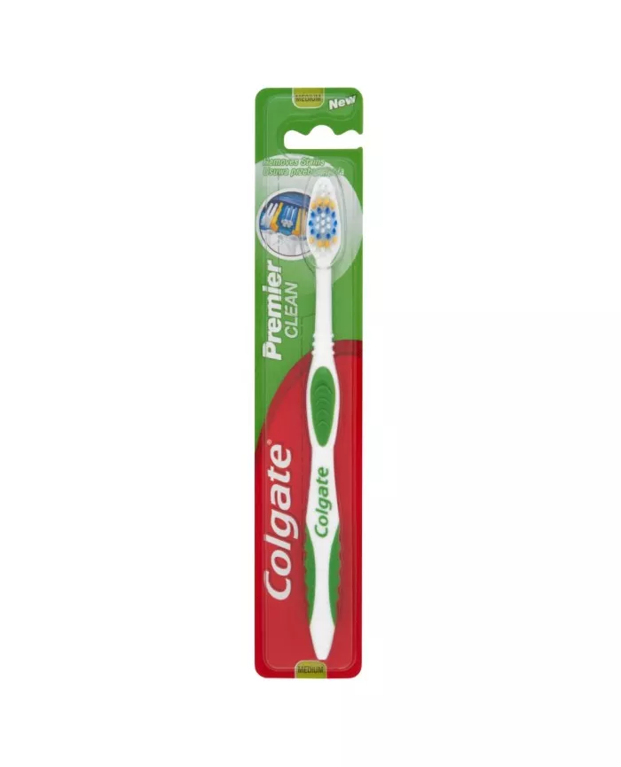 Szczoteczka do zębów Colgate Premier. Okrągłę włókna pomagają usuwać przebarwienia z zębów. Czyścik do języka usuwa bakterie, które powodują nieprzyjemny zapach.