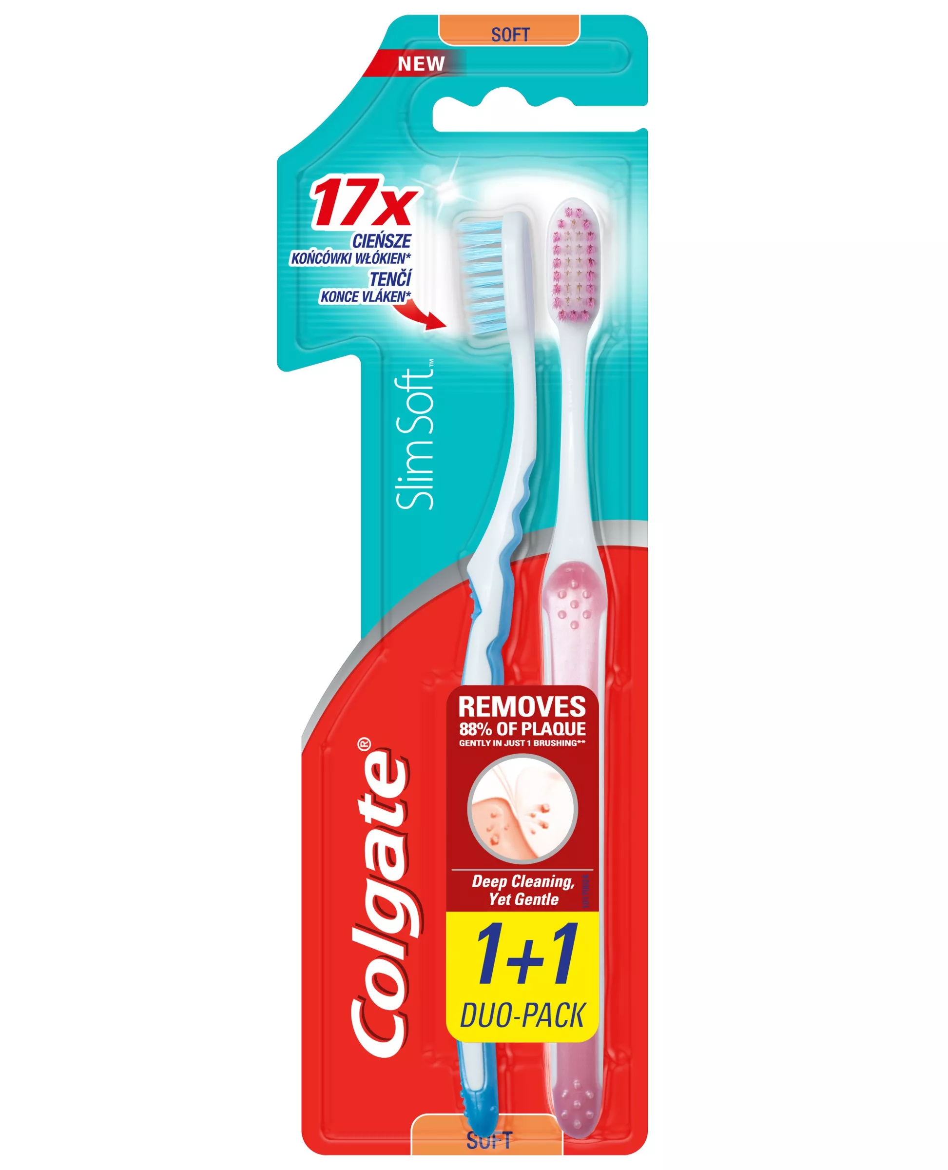 Szczoteczka do zębów Colgate Slim Soft Advanced Design Edition to wyjątkowo miękka szczoteczka z włóknem, które sięga 7 razy głębiej poniżej linii dziąseł w porównaniu do zwykłej szczoteczki do zębów z płaskim wykończeniem i zaokrąglonymi końcówkami włókien