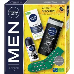 Dane produktowe Zestaw kosmetyków męskich Nivea MEN Active Sensitive Odkryj produkty do pielęgnacji, które bliski Ci mężczyzna chciałby znaleźć pod choinką. Ale to nie wszystko! W zestawie znajdziesz też skarpetki męskie z aplikacjami w kształcie uroczych pingwinów. W zestawie: - NIVEA MEN...