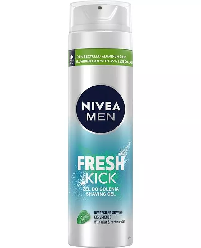 Żel do golenia NIVEA MEN FRESH KICK to odświeżająca formuła z miętą oraz wodą kaktusową, która natychmiastowo odświeża i pozostawia uczucie nawilżonej skóry. Żel do golenia chroni skórę przed ostrzem maszynki, pozwalając na bliskie i komfortowe golenie przy skórze. Dodatkowo, formuła chroni nie tylko przed mikro-zacięciami, ale również podrażnieniami skóry. Pożegnaj zacięcia, powitaj gładką skórę i uczucie odświeżenia po goleniu! Aby zachować zdrowy i zadbany wygląd skóry, swoją regularną pielęgnację uzupełnij także o kosmetyki męskie po goleniu, np. wodę po goleniu z linii NIVEA MEN Fresh Kick.