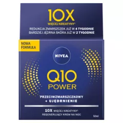 Dane produktowe Nivea Q10 Ujędrnienie Przeciwzmarszczkowy krem na noc 50 ml NIVEA Q10 UJĘDRNIENIE Przeciwzmarszczkowy Nawilżający krem na noc zawiera najczystszy, w 100% identyczny jak w skórze Koenzym Q10 i Kreatynę. Zapewnia podwójne działanie przeciwzmarszczkowe przez 24h. Chroni komórki...