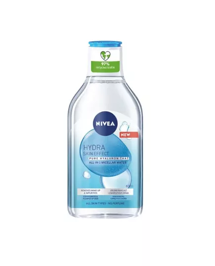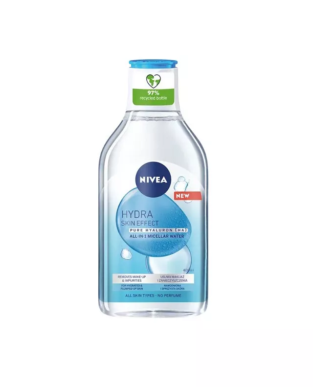 NIVEA® HYDRA SKIN EFFECT Płyn Micelarny z czystym kwasem hialuronowym łagodnie, a zarazem skutecznie usuwa zanieczyszczenia i makijaż, nie wysuszając skóry. 1. Głęboko oczyszcza, nie przesuszając skóry. 2. Efektywnie usuwa makijaż bez pozostałości. 3. Skóra wypełniona nawodnieniem od środka pozostaje miękka i napięta. Po użyciu cera wygląda zdrowo i może oddychać. Dzięki swojej wyjątkowej formule płyn micelarny jest odpowiedni dla wszystkich typów cery. Zawiera czysty kwas hialuronowy [HA], który aktywuje komórki skóry do produkcji własnego kwasu hialuronowego*. Tak czyste i cenne cząsteczki kwasu hialuronowego otrzymywane są dzięki wieloetapowej filtracji w procesie produkcji. Przebadany dermatologicznie i okulistycznie. *badanie na komórkach skóry in vitro