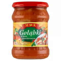 Dane produktowe MK Gołąbki w sosie pomidorowym 500 g Składniki: woda, kapusta biała 23 %, ryż 10,6 %, mięso wieprzowe 8,4 %, warzywa 35 % (marchew, cebula), koncentrat pomidorowy 3,1 %, zagęstnik: skrobia modyfikowana kukurydziana, białko SOJOWE, mąka PSZENNA, warzywa suszone (marchew,...