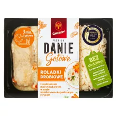 Dane produktowe Sokołów Premium Danie gotowe roladki drobiowe 360 g Składniki: roladki - 42% (mięso kurczaka (65%), woda, marchew (12%), mąka PSZENNA, sól spożywcza, skrobia ziemniaczana, błonnik PSZENNY bezglutenowy, kasza manna PSZENNA, skrobia kukurydziana, cebula, masło (z MLEKA),...