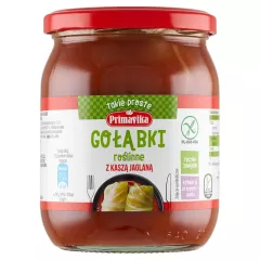Dane produktowe Primavika Gołąbki wegetariańskie z kaszą jaglaną 480 g Składniki: woda, kapusta biała 43%, pieczarki 13%, koncentrat pomidorowy 13%, marchew, kasza jaglana 5,5% (kasza jaglana 5%, mąka jaglana 0,5%), teksturowane białko SOJOWE, cebula, skrobia kukurydziana, bulion...
