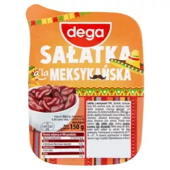 Dane produktowe dega Sałatka a'la meksykańska 150 g Składniki: ziemniaki, fasola 16 %, marchew, woda, olej rzepakowy, cukier, ogórek, przyprawy (zawierają GORCZYCĘ), ocet spirytusowy, sól, skrobia modyfikowana, żółtko JAJA w proszku, regulatory kwasowości: kwas mlekowy, kwas cytrynowy,...
