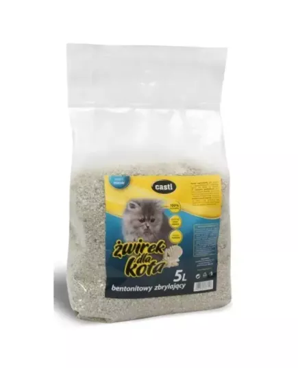 Wysokiej jakości żwirek w 100% z naturalnego bentonitu, zbrylający się, wzbogacony kompozycją zapachową (zapach morski). Delikatne granulki zbrylają się błyskawicznie, chłoną płyny i zapachy, tworząc zwarte bryłki. Bryłki wystarczy usunąć, bez konieczności wymiany całej zawartości kuwety, przez co żwirek bentonitowy zbrylający CASTI jest wydajny i oszczędny w użyciu.