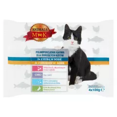 Dane produktowe MK Animals Karma dla kotów 4 x 100 g Pełnoporcjowa karma dla dorosłych kotów z drobiem i rybą w sosie. Składniki: pełnoporcjowa karma dla dorosłych kotów z drobiem w sosie: mięso i produkty pochodzenia zwierzęcego (4 % drobiu), zboża, ryby i produkty pochodzenia rybnego,...