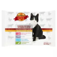 Dane produktowe MK Animals Karma dla kotów 4 x 100 g Pełnoporcjowa karma dla dorosłych kotów z wołowiną i drobiem w sosie. Składniki: Pełnoporcjowa karma dla dorosłych kotów z wołowiną w sosie: mięso i produkty pochodzenia zwierzęcego (4 % wołowiny), zboża, ryby i produkty pochodzenia...