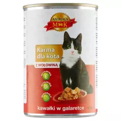 Dane produktowe MK Animals Karma dla kota kawałki w galaretce z wołowiną 415 g Pełnoporcjowa karma dla dorosłych kotów z wołowiną - kawałki w galaretce Składniki: mięso i produkty pochodzenia zwierzęcego (4 % wołowiny), zboża, ryby i produkty pochodzenia rybnego, substancje mineralne...