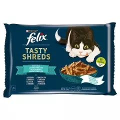 Dane produktowe Felix Tasty Shreds Karma dla dorosłych kotów rybne smaki w sosie 320 g (4 x 80 g) Pełnoporcjowa karma dla dorosłych kotów. Karma odpowiednia także dla kotów wysterylizowanych. Składniki: z łososiem w sosie: mięso i produkty pochodzenia zwierzęcego* (16 %), roślinne...
