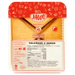 Jawo Naleśniki z serem 1 kg Produkt jest wykonany ręcznie. Naleśniki z serem. Produkt głęboko mrożony. Cechy ręcznie robione, Poznaj Dobrą Żywność, wystarczy podgrzać Składniki ser twarogowy (38%), woda, mąka pszenna , cukier, masa jajowa , serwatka w proszku, aromat wanilinowy w...