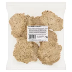 Dane produktowe Mrożona potrawa Chicken Corregio 1,3 kg Składniki: filet z kurczaka 62 %, panier 27 % (mąka PSZENNA, skrobia ziemniaczana, ser corregio (MLEKO pasteryzowane, sól, bakterie fermentacji mlekowej, stabilizator E509, podpuszczka, substancja konserwująca - lizozym z JAJKA),...