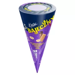 Dane produktowe E. Wedel Bajeczny Lody 110 ml Składniki: MLEKO odtłuszczone, rożek waflowy (15,7 %) (mąka PSZENNA, cukier, tłuszcz kokosowy, emulgator: lecytyny słonecznikowe, sól), cukier, czekolada mleczna (8,0 %) (cukier, tłuszcz kakaowy, MLEKO pełne w proszku, miazga kakaowa,...