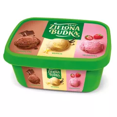 Dane produktowe Zielona Budka Lody czekolada wanilia truskawka 1000 ml Składniki: MLEKO odtłuszczone (odtworzone), cukier, tłuszcz kokosowy, syrop glukozowy, przecier truskawkowy 8 %, serwatka w proszku (z MLEKA), glukoza, czekolada 1 % (cukier, miazga kakaowa, tłuszcz kakaowy,...