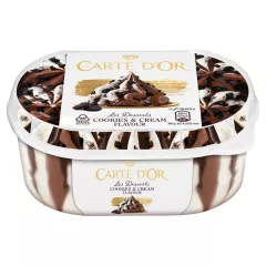 Dane produktowe Carte D'Or Lody o smaku ciasteczkowo-śmietankowym i czekoladowe z sosem czekoladowym 900 ml Składniki: odtworzone odtłuszczone MLEKO, cukier, syrop glukozowo-fruktozowy, tłuszcz kokosowy, kakao w proszku o obniżonej zawartości tłuszczu (4%), mąka PSZENNA, preparat...