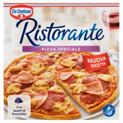Dane produktowe Dr. Oetker Ristorante Pizza Speciale 345 g Składniki: mąka PSZENNA, 15 % SER (MOZZARELLA, EDAMSKI), 12 % przetarte pomidory, woda, 6,4 % salami (mięso wieprzowe, tłuszcz wieprzowy, sól, przyprawy, dekstroza, cebula w proszku, czosnek w proszku, ekstrakty przypraw,...