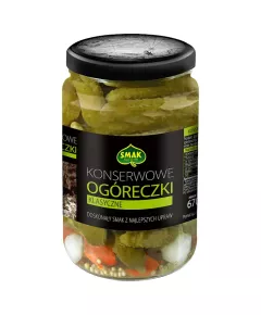 Dane produktowe Smak Konserwowe ogóreczki klasyczne 670 g Zastosowanie: jako składnik sałatek, surówek i koreczków, dodatek do dań, mięsnych oraz jako samodzielna przekąska. Składniki: ogórki 49 % (zawierają SIARCZYNY), woda, cukier, ocet spirytusowy, cebula, papryka, sól, przyprawy...