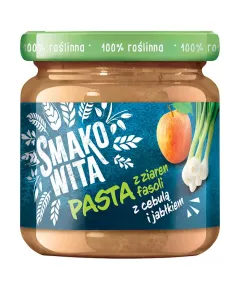 Dane produktowe Smakowita Pasta z ziaren fasoli z cebulą i jabłkiem 180 g - do kanapek - do tostów i grzanek - do naleśników - do pierogów Składniki: fasola biała - 46 % (fasola biała ziarna - 39 %, woda, sól), woda, olej rzepakowy, SELER marynowany (SELER, woda, regulator kwasowości:...