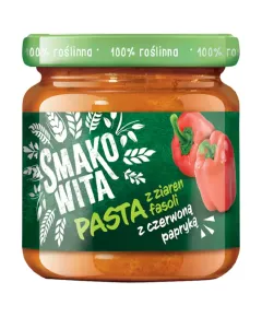 Dane produktowe Smakowita Pasta z ziaren fasoli z czerwoną papryką 180 g - do kanapek - do tostów i grzanek - do naleśników - do pierogów Składniki: fasola biała - 50 % (fasola biała ziarna - 42 %, woda, sól), olej rzepakowy, SELER marynowany (SELER, woda, regulator kwasowości: kwas...
