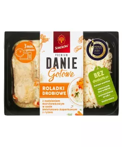 Dane produktowe Sokołów Premium Danie gotowe roladki drobiowe 360 g Składniki: roladki - 42% (mięso kurczaka (65%), woda, marchew (12%), mąka PSZENNA, sól spożywcza, skrobia ziemniaczana, błonnik PSZENNY bezglutenowy, kasza manna PSZENNA, skrobia kukurydziana, cebula, masło (z MLEKA),...