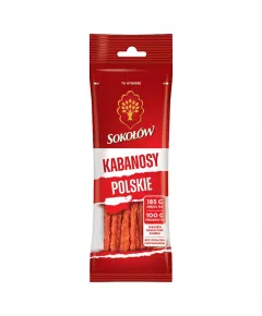 Dane produktowe Sokołów Kabanosy francuskie 100 g Dla tych, co kochają smak! Extra kruche Do pracy Na imprezę Do filmu Do szkoły Nad morze W góry Na biwak Gdziekolwiek chcesz Składniki: mięso wieprzowe, mięso wołowe, substancja żelująca: alginian sodu, sól, białko SOJOWE, przyprawy,...