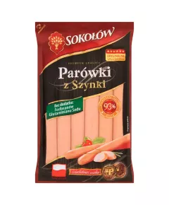 Dane produktowe Sokołów Parówki z szynki Składniki: mięso wieprzowe z szynki 93%, sól, białko wieprzowe kolagenowe, aromaty, przyprawy i ich ekstrakty, regulatory kwasowości: cytryniany sodu, octany sodu, przeciwutleniacz: izoaskorbinian sodu, aromat dymu wędzarniczego, substancja...