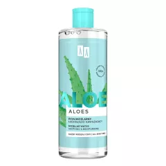 Dane produktowe AA Aloes 100% aloe vera extract płyn micelarny łagodząco-nawilżający 400 ml Multinawilżający program naturalnej pielęgnacji skóry wymagającej ukojenia, regeneracji i długotrwałego nawodnienia. Natychmiastowy ratunek dla skóry przesuszonej, swędzącej, uszkodzonej, dzięki...
