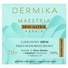 Dane produktowe Dermika Maestria Luksusowy krem przeciwzmarszczkowy 70+ na dzień i na noc 50 ml Luksusowy krem przeciwzmarszczkowy 70+ na dzień i na noc dla cery dojrzałej, również wrażliwej, ma wpływ na spowolnienie procesów wiotczenia naskórka oraz zmniejszenie widoczności zmarszczek....