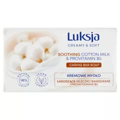 Dane produktowe Luksja Creamy & Soft Kremowe mydło łagodzące mleczko bawełniane i prowitamina B5 90 g Kremowe mydło w kostce. Zawiera mleczko bawełniane i prowitaminą B5 o łagodzących właściwościach. - 98 % składników naturalnego pochodzenia - Biodegradowalna formuła Testowane...