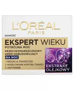 Dane produktowe L'Oreal Paris Ekspert Wieku 60+ Przeciwzmarszczkowy krem odbudowujący na noc 50 ml Z upływem czasu zmieniają się potrzeby skóry w zakresie pielęgnacji przeciwzmarszczkowej. L'Oréal Paris stworzyło linię kosmetyków Ekspert Wieku, ukierunkowaną na szczególne potrzeby skóry w...