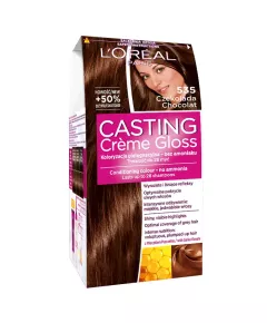 Dane produktowe L'Oreal Paris Casting Creme Gloss Farba do włosów 535 czekolada Mieniący się kolor o widocznych, lśniących refleksach Formuła kremu bez amoniaku zapewnia optymalne pokrycie siwych włosów. Krem odtwarza bogactwo naturalnych kolorów włosów, pełnych widocznych refleksów. To tak,...