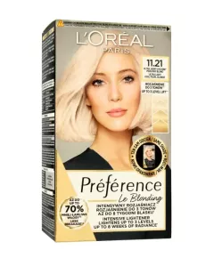 Uzyskaj rozjaśnienie aż do 3 tonów dzięki wyjątkowej mocy Preference Intensive Lighteners. Formuła o konsystencji przeźroczystego żelu nadaje włosom odcień intensywnego blondu ze świetlistymi refleksami. DO 8 TYGODNI BLASKU** Nałóż odżywkę SHINE PROTECT CONDITIONER wzbogaconą filtrami UV i...