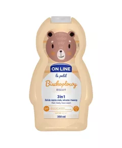 Żel do mycia ciała, włosów i twarzy 3w1 biszkoptowy 350 ml Nawilżający żel 3w1 o zapachu waniliowego biszkopta. Myje, jednocześnie pielęgnując ciało, włosy i twarz dziecka. Nie szczypie w oczy, ułatwia rozczesywanie włosów po kąpieli i zmniejsza ich elektryzowanie. Produkt przebadany...