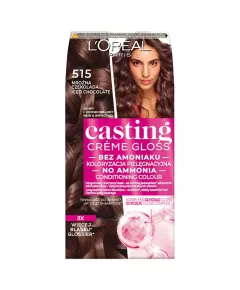 Dane produktowe L'Oreal Paris Casting Creme Gloss Farba do włosów 515 mroźna czekolada Koloryzacja pielęgnacyjna - bez amoniaku Przepyszne i lśniące refleksy. Trwałość do 28 myć Mieniący się kolor o przepysznych, lśniących refleksach - Formuła kremu bez amoniaku zapewnia optymalne pokrycie...