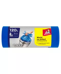 Dane produktowe Jan Niezbędny Easy-Pack Worki na śmieci 120 l 15 sztuk Uniwersalne worki na śmieci wykonane z folii w kolorze niebiesko-metalicznym, zakończone falą, która umożliwia łatwe zawiązanie i przenoszenie wypełnionego worka. Wygodne przenoszenie i wiązanie - posiadają system wiązania...