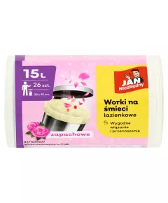 Dane produktowe Jan Niezbędny Worki łazienkowe z nadrukiem 15 l 26 sztuk Pasują do każdej łazienki - wykonane są z kremowej folii. Ich neutralny i dyskretny wygląd z łatwością wkomponuje się do wnętrza każdej łazienki. Wygodne przenoszenie i wiązanie - posiadają system wiązania typu Easy...