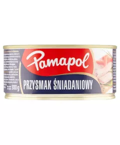 Dane produktowe Pamapol Przysmak śniadaniowy 300 g Składniki: mięso wieprzowe 62%, woda, tłuszcz wieprzowy, stabilizator: trifosforan, sól, substancja zagęszczająca: przetworzone wodorosty morskie z gatunku Eucheuma, białko zwierzęce kolagenowe wieprzowe, cukry, wzmacniacze smaku:...