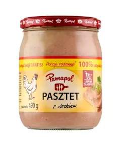 Dane produktowe Pamapol Pasztet z drobiem 490 g Składniki: woda, mięso oddzielone mechanicznie z kurczaka 14 %, tłuszcz wieprzowy, wątroba wieprzowa 8 %, skórki z kurczaka 6,8 %, skórki wieprzowe, kasza manna (z PSZENICY), mąka PSZENNA, sól, mąka SOJOWA, białka MLEKA, stabilizatory:...