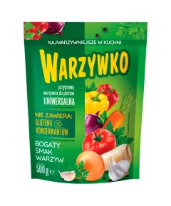 Dane produktowe Warzywko Przyprawa warzywna do potraw uniwersalna 500 g Warzywko wyśmienicie nadaje się do zup, sosów oraz dań mięsnych, rybnych i warzywnych. Bez dodatku substancji konserwujących. Składniki: sól , warzywa suszone 15,1% (pasternak, marchew, cebula, czosnek, natka...