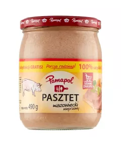 Dane produktowe Pamapol Pasztet mazowiecki wieprzowy 490 g Składniki: woda, skórki wieprzowe, wątroba wieprzowa 10%, tłuszcz wieprzowy, kasza manna (z PSZENICY), mąka PSZENNA, błonnik roślinny, sól, mąka SOJOWA, białka MLEKA, stabilizatory: cytryniany sodu, substancje zagęszczające:...