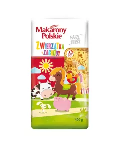 Dane produktowe Makarony Polskie Makaron zwierzątka z zagrody 400 g Składniki: mąka z PSZENICY zwyczajnej, przyprawa: kurkuma Dodatki Marka Makarony Polskie Dodatkowe informacje Tuż obok miejsca, w którym dojrzewają w promieniach letniego słońca łany zbóż, z których powstają...