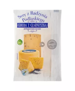 Dane produktowe Sery z Radzynia Podlaskiego Gouda z czarnuszką 135 g Ser dojrzewający typu holenderskiego doprawiony czarnuszką. Jego naturalnie delikatny smak dopełniają ziołowe nuty o zdecydowanym, wytrawnym charakterze. Doskonały jako składnik sałatki oraz w towarzystwie pszenicznych piw i...