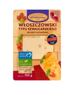 Dane produktowe Włoszczowa Ser żółty włoszczowski typu szwajcarskiego w plastrach 150 g Ser włoszczowski plasterkowany Typu szwajcarskiego Składniki: MLEKO pasteryzowane, sól spożywcza, stabilizator: chlorek wapnia, kultury bakterii mlekowych (MLEKO), podpuszczka mikrobiologiczna,...