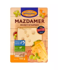 Dane produktowe Włoszczowa Ser żółty mazdamer w plastrach 150 g Ser Mazdamer plastrowany Składniki: MLEKO pasteryzowane, sól spożywcza, stabilizator: chlorek wapnia, kultury bakterii mlekowych (MLEKO), podpuszczka mikrobiologiczna, barwnik: karoteny Dodatki Nie zawiera: konserwanty...